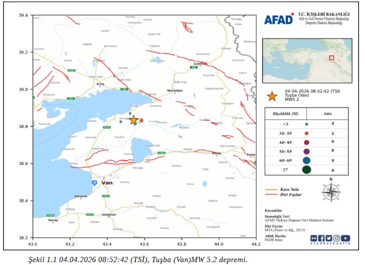 Afet ve Acil Durum Yönetimi Başkanlığı, 4 Nisan’da Van’ın Tuşba ilçesinde meydana gelen 5.2 büyüklüğündeki depreme ilişkin ön değerlendirme raporunu yayımladı. Depremin ardından 4 artçı sarsıntı kaydedildi.