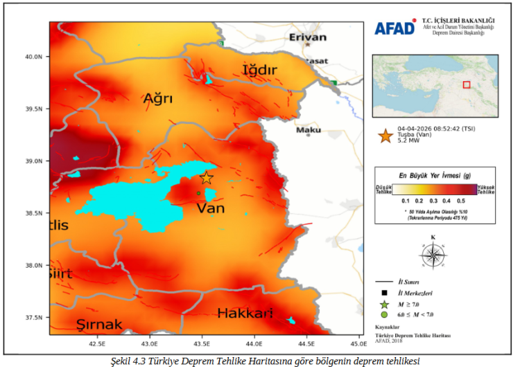 ANKARA (İGFA) - Afet ve Acil Durum Yönetimi Başkanlığı (AFAD), 4 Nisan 2026 tarihinde Van’ın Tuşba ilçesinde meydana gelen 5,2 büyüklüğündeki depreme ilişkin ön değerlendirme raporunu kamuoyuyla paylaştı.
