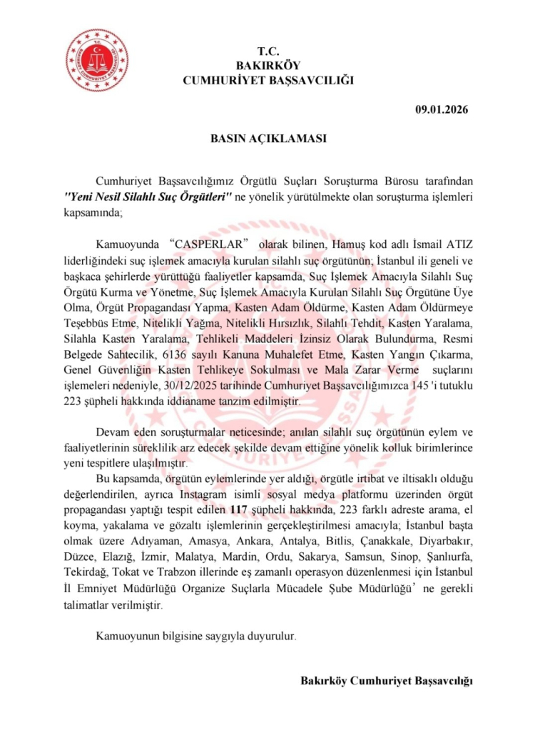 Bakırköy Cumhuriyet Başsavcılığı, kamuoyunda “Casperlar” olarak bilinen ve “Hamuş” kod adlı İsmail Atız’ın liderliğini yaptığı silahlı suç örgütüne yönelik kapsamlı soruşturma kapsamında 223 şüpheli hakkında iddianame düzenlendiğini açıkladı. Örgütle bağlantılı 117 şüpheliye yönelik 26 ilde eş zamanlı operasyon talimatı verildi.