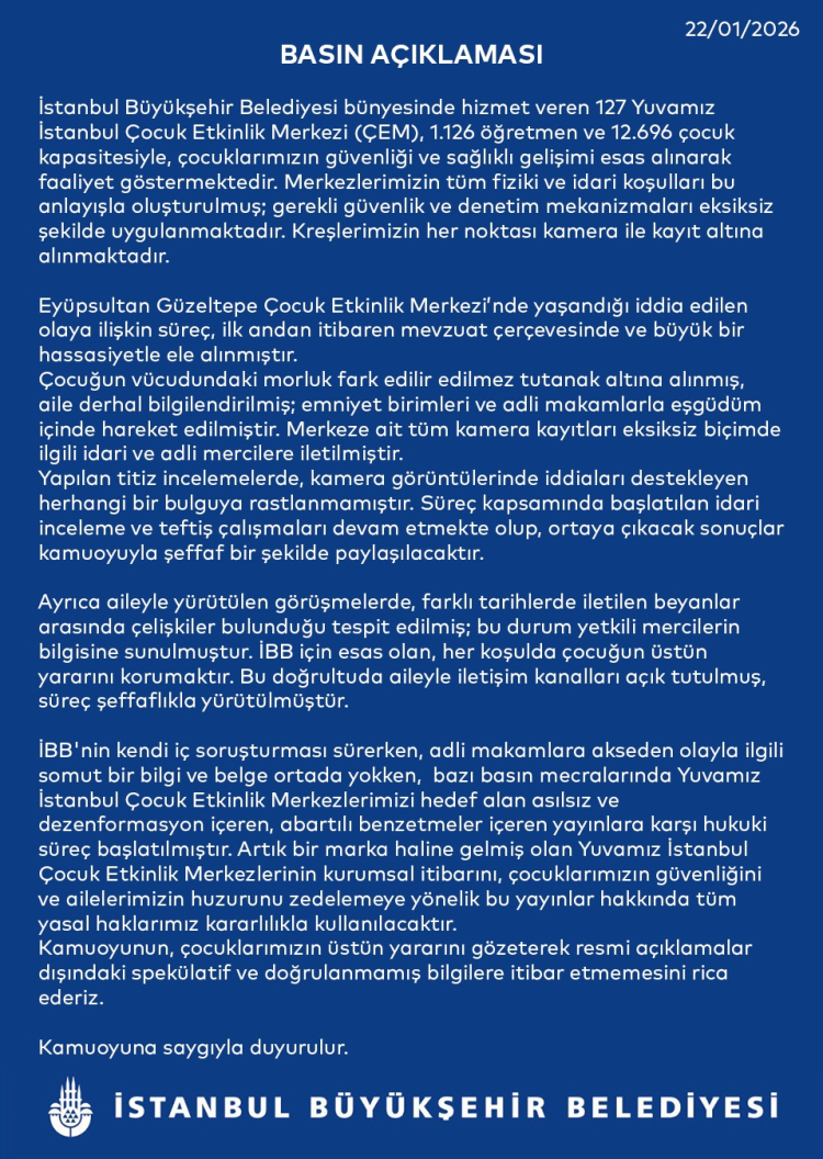 Eyüpsultan Güzeltepe Çocuk Etkinlik Merkezi’nde yaşandığı öne sürülen olaya ilişkin sürecin ilk andan itibaren büyük bir hassasiyetle ele alındığı belirtilen açıklamada, çocuğun vücudundaki morluğun fark edilmesiyle birlikte durumun tutanak altına alındığı, ailenin derhal bilgilendirildiği ve emniyet birimleri ile adli makamlarla eşgüdüm içinde hareket edildiği ifade edildi. Merkeze ait tüm kamera kayıtlarının eksiksiz şekilde ilgili idari ve adli mercilere iletildiği kaydedildi.