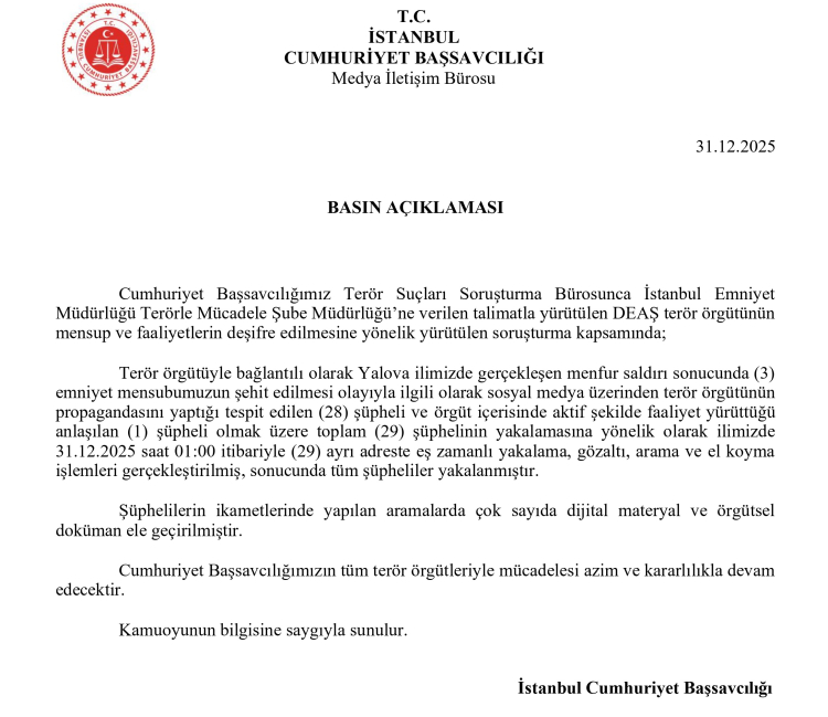 Yalova’da kısa süre önce meydana gelen ve üç emniyet mensubunun şehit olduğu DEAŞ saldırısıyla bağlantılı olarak yürütülen çalışmalarda; sosyal medya üzerinden terör örgütü propagandası yaptığı belirlenen 28 şüpheli ile örgüt içerisinde aktif faaliyet yürüttüğü tespit edilen 1 şüpheli olmak üzere toplam 29 kişi hakkında işlem yapıldı.