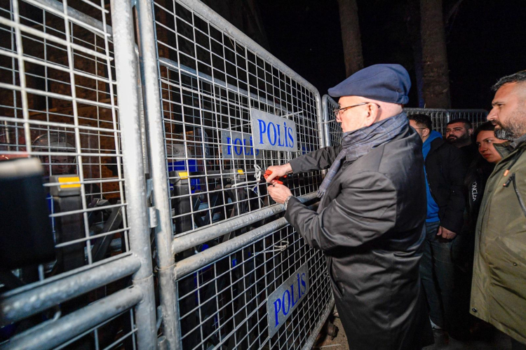 İzmir Büyükşehir Belediyesi’ne ait Meslek Fabrikası’na yönelik el koyma girişimine karşı başlatılan nöbet, perşembe gecesi de sürdü. Başkan Dr. Cemil Tugay öncülüğünde bir araya gelen yurttaşlar, türkülerle dayanışmayı büyüttü. CHP Şanlıurfa Milletvekili Mahmut Tanal da mücadeleye katıldı. Tanal, pense ile binayı çevreleyen polis barikatlarını birbirine bağlayan plastik kelepçeleri kesti.