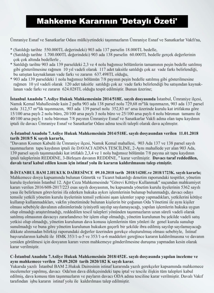 İstanbul'da Ümraniye Esnaf ve Sanatkârlar Odası’na ait taşınmazların önceki yönetim tarafından usulsüz şekilde bir vakfa devredilmesine ilişkin açılan tapu iptal ve tescil davası, tüm yargı aşamalarında oda lehine sonuçlandı. Yaklaşık 500 milyon TL değerindeki taşınmazlar yeniden esnafın oldu.